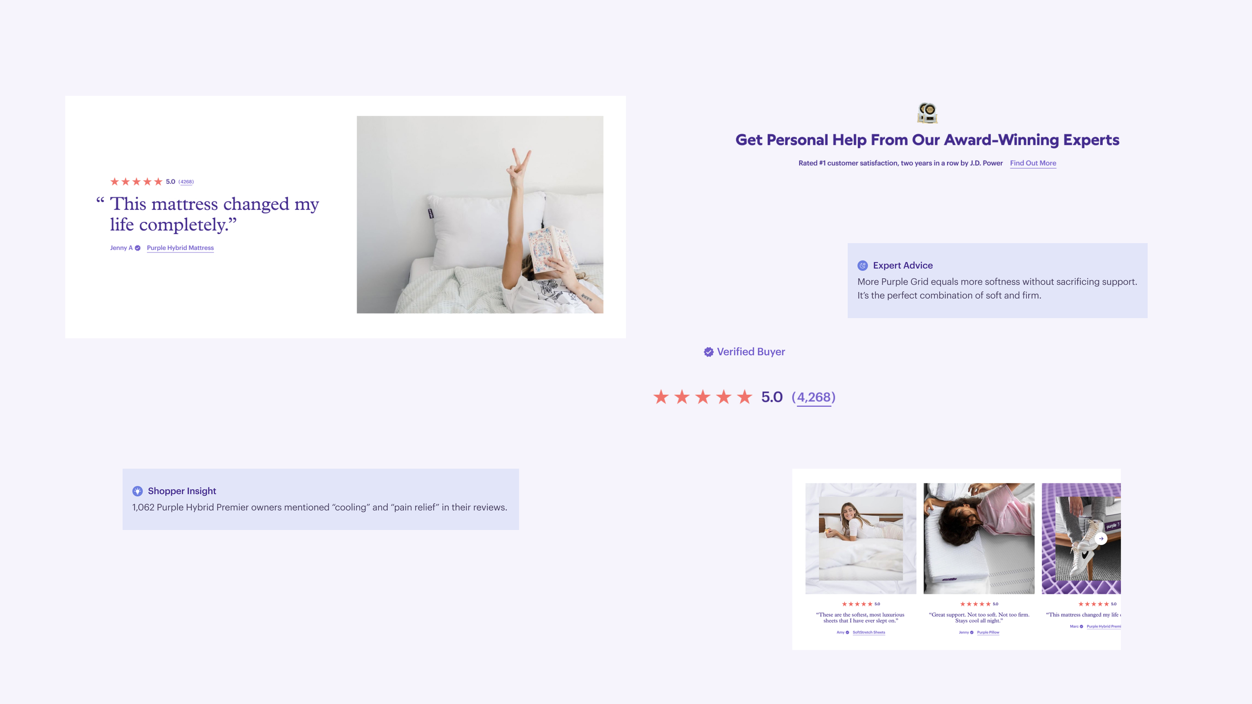 Purple’s products are loved by customers, and their stories became a powerful driver of confidence. Shoppers seek validation from people like them, what they chose, why it worked, and how it truly feels. Because a mattress is an infrequent, high-consideration purchase, we reimagined key decision moments by integrating sleep-expert guidance directly into the experience.