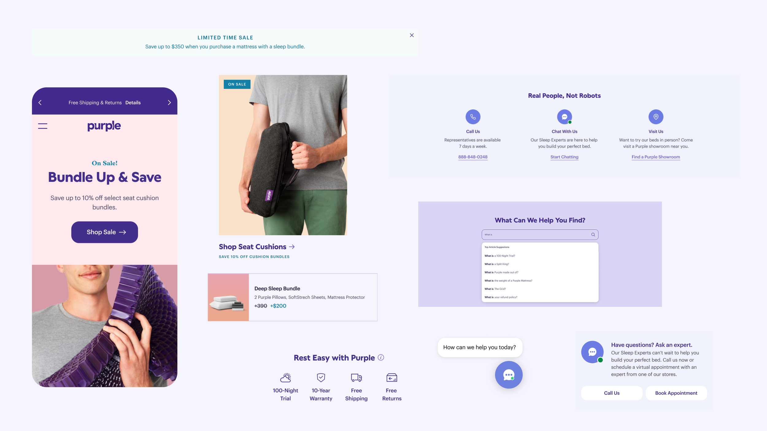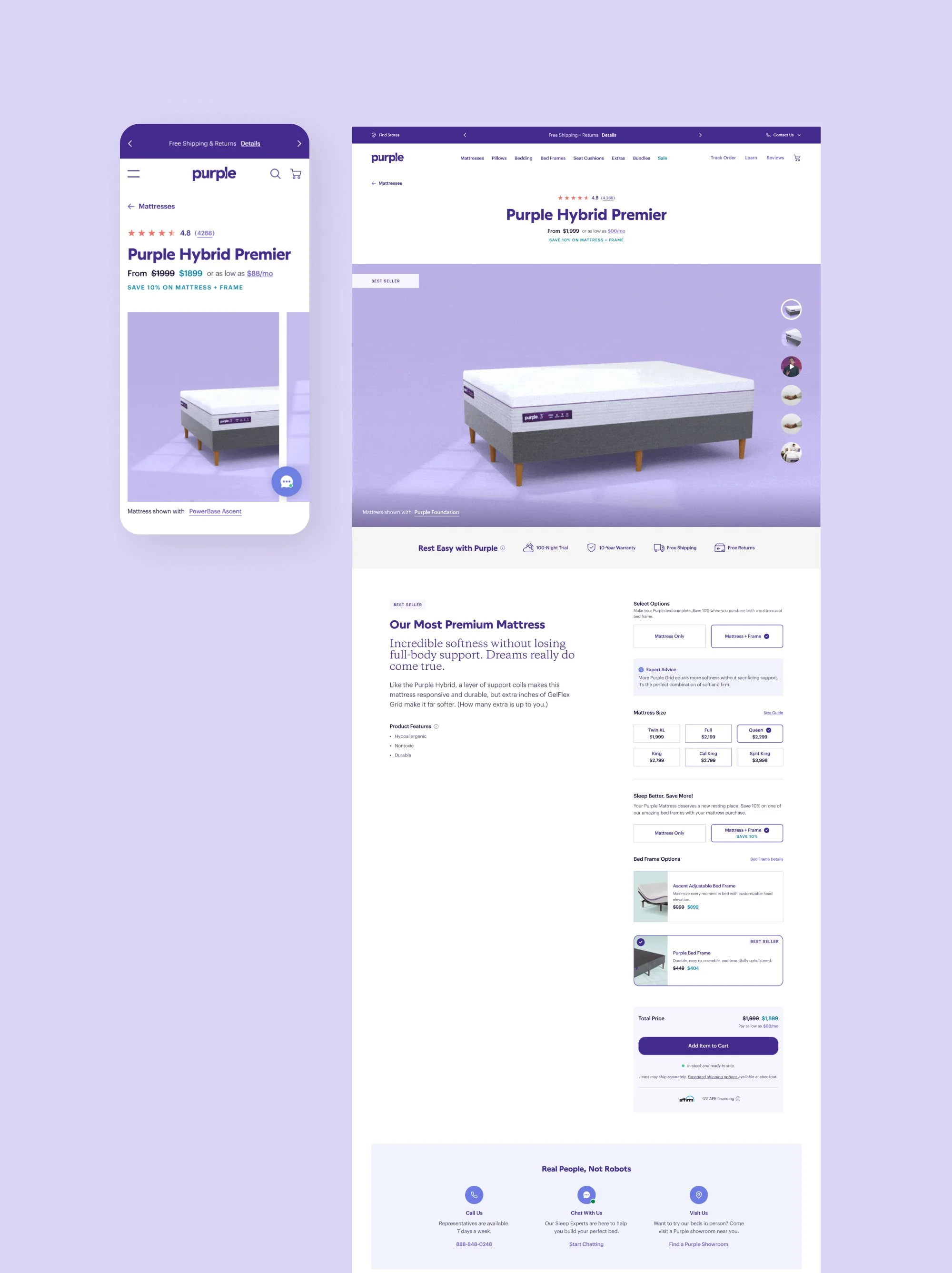To better understand how customers make decisions, we met with customer care and walked through the sales process with in-store associates. Drawing from these insights, we created strategic touchpoints for users to connect with Purple’s sleep experts, guidance that’s available exactly when it’s needed without feeling overbearing. To further reduce friction, warranties and potential shopping barriers were made highly visible and easy to understand, helping customers move through the experience with confidence and clarity.